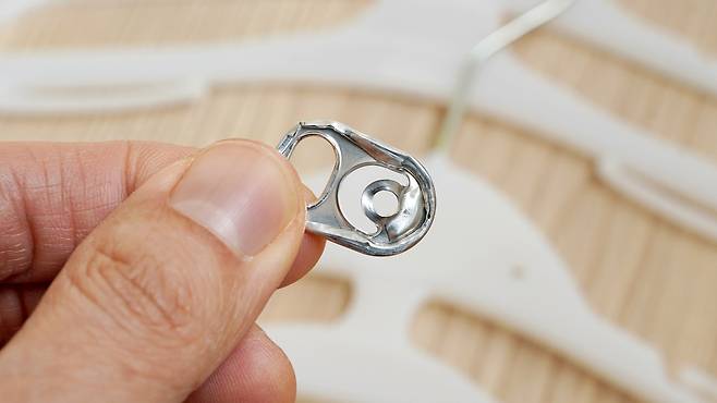 이제 캔따개를 이용한 재활용 방법을 알려드릴 건데요. 먼저 캔따개를 분리하세요. 그리고 캔따개 구멍에 있는 부분을 잘 접어 줍니다.