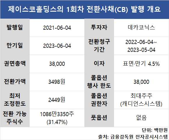 해당 CB는 지난 2021년 6월 제이스코홀딩스가 운영자금 조달과 채무상환을 목적으로 발행한 것이었다. 1994년 코스닥 시장에 상장한 이후 처음 발행한 CB이기도 하다. 표면이자율과 만기이자율은 4.5%, 만기일은 2023년 6월 4일로 설정됐다.
