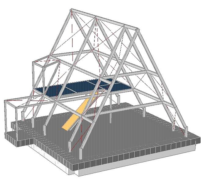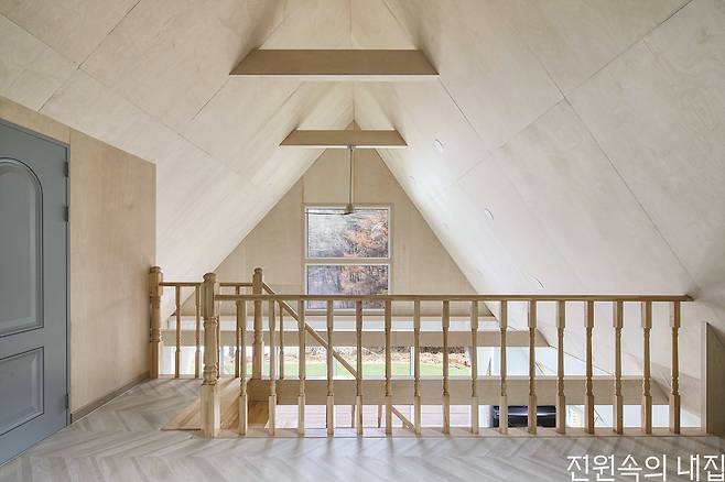 A자 형태의 프레임은 일반적인 구조체 설계로는 구현하기 힘들지만, 빔하우스만의 철골 기둥 구조를 활용해 입체적인 공간을 실내에 구현해냈다.