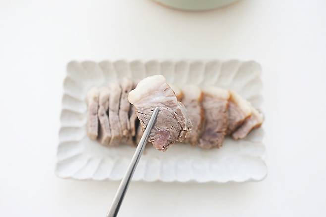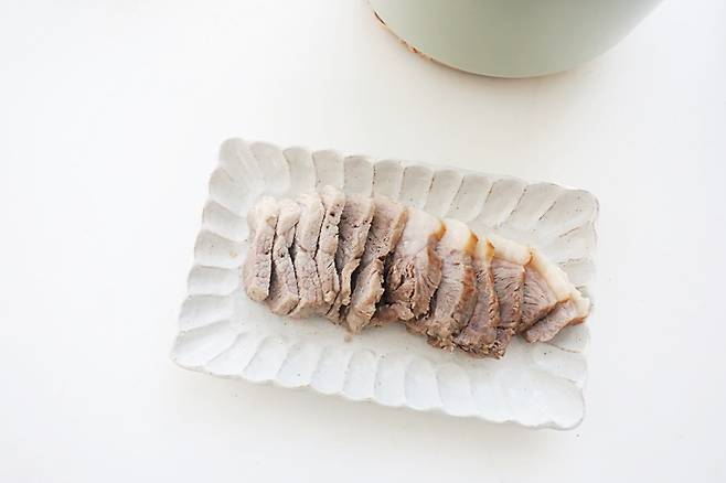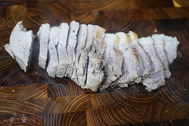 수육은 뜨거울 때 한입 크기로 잘라주세요!