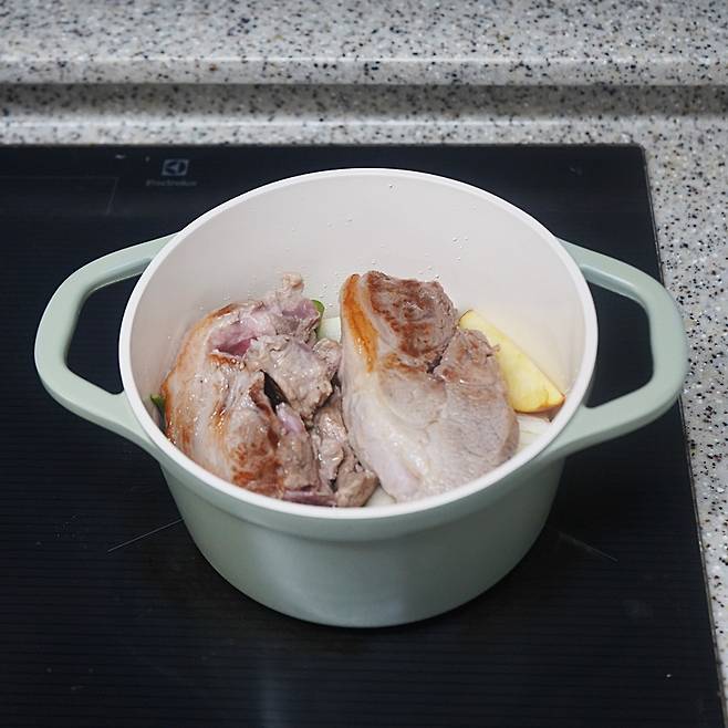 냄비 뚜껑을 닫고 약불에서 40분~1시간 정도 고기를 익힙니다.