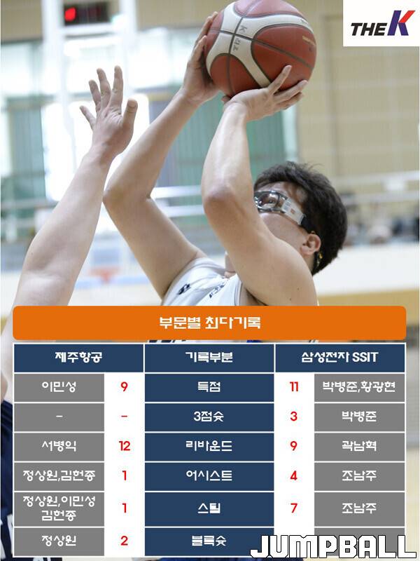 삼성전자 SSIT는 2일 서울 관악구 인근 체육관에서 열린 EVISU SPORTS배 2023 The K직장인농구리그(www.kbasket.kr) 1차대회 F조 예선에서 뉴페이스 황광현(11점 6리바운드), 박병준(11점 6스틸 4리바운드, 3점슛 3개)를 필두로 조남주(9점 7스틸 4어시스트), 곽남혁(8점 9리바운드) 등 출전선수 11명 모두 골맛을 보는 등, 고른 활약에 힘입어 제주항공을 63-27로 꺾었다.