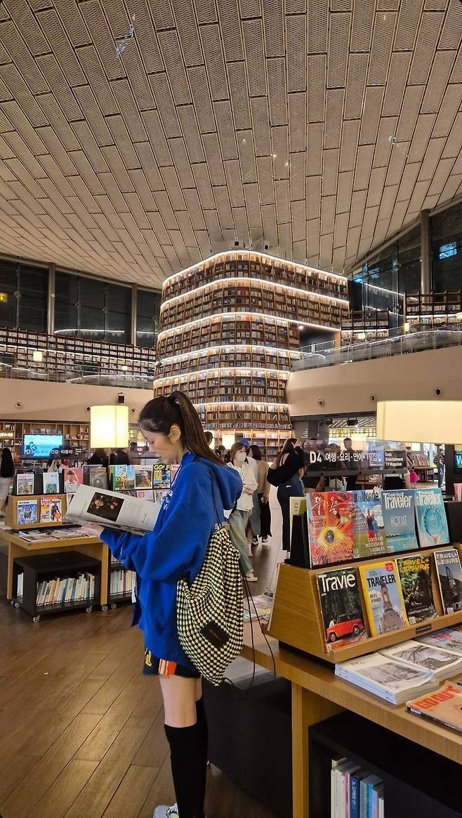 블루 컬러의 박시한 후드 집업에 짧은 쇼츠, 니삭스와 운동화를 매치한 독보적인 원마일룩을 선보였습니다.