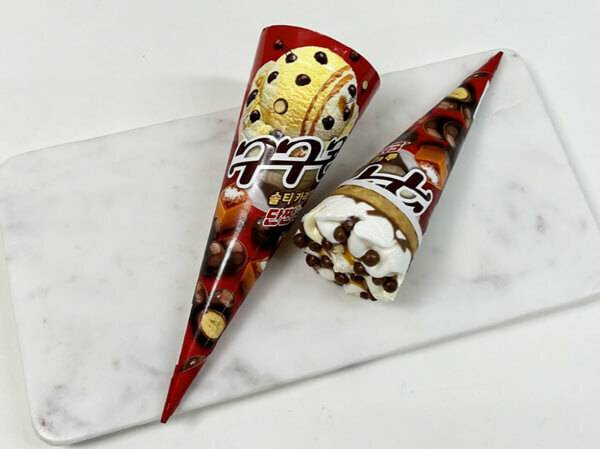 롯데푸드는 단짠이 매력적인 신제품 ‘구구콘 솔티카라멜’을 ‘구구 미니’와 함께 출시했다. 구구콘 솔티카라멜은 진한 우유 아이스크림에 쫀득쫀득한 마시멜로 아이스크림, 단짠단짠 솔티캐러멜 시럽이 조화를 이루는 제품이다. 바삭하게 씹히는 미니 초코볼로 맛과 식감을 더했다. 롯데푸드는 초코볼이 올라간 콘 아이스크림은 구구콘이 최초라고 전하고 있다. 편의점 판매가는 2천 원이다.