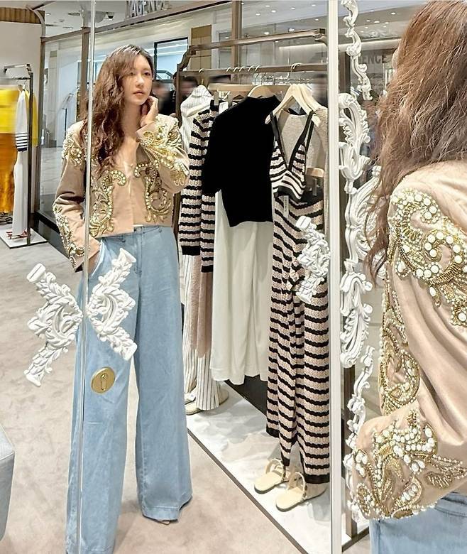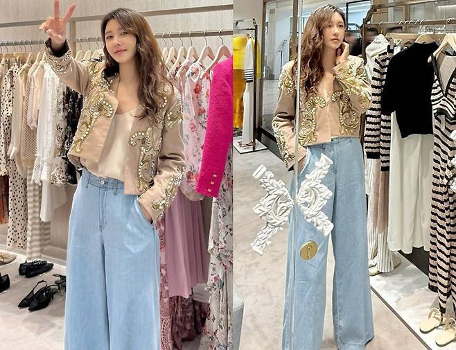 이지아는 클래식하면서도 고급스러운 느낌의 베이지톤 골드 자수가 돋보이는 크롭 재킷으로 시선을 모았습니다.