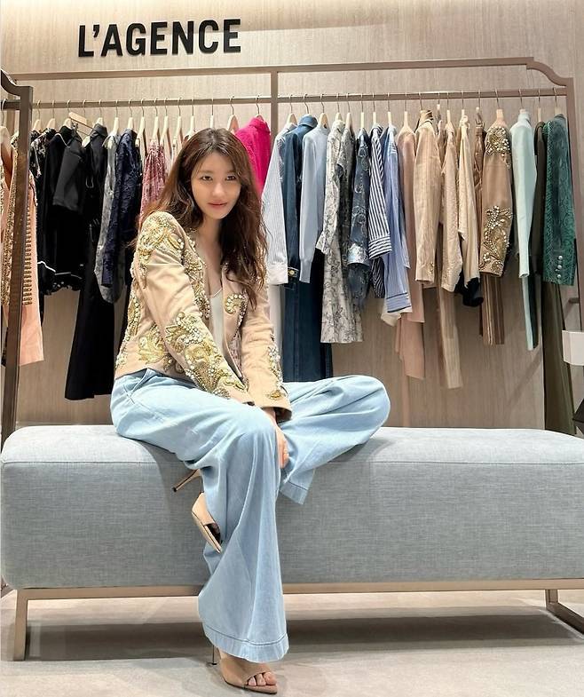 특히 하이힐 샌들과 골드 포인트 액세서리를 매치해 스타일의 완성도를 높였고, 이지아 특유의 내추럴 웨이브 헤어와 자연스러운 메이크업이 고급스러운 룩에 우아함을 더했습니다.