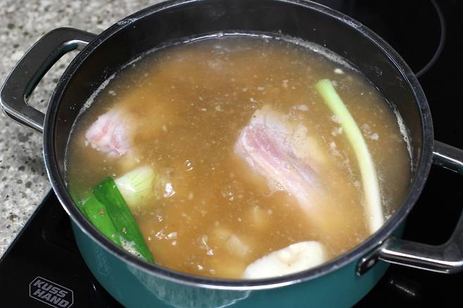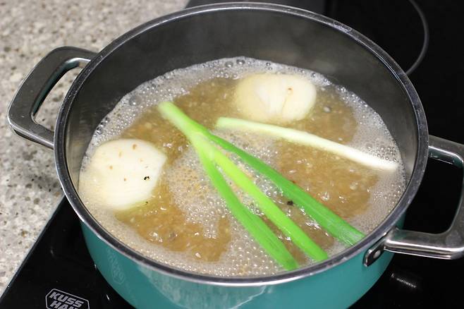 냄비에 삶을 물을 넉넉히 붓고 양파 1개, 대파 1대, 통후추 반큰술, 다진마늘 1큰술 넣어 팔팔 끓여요.