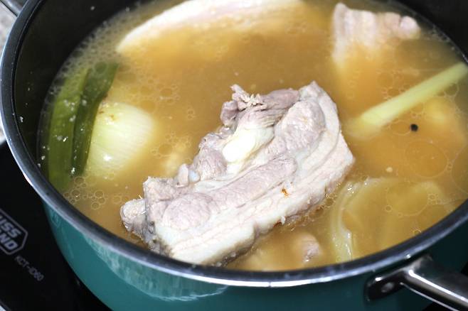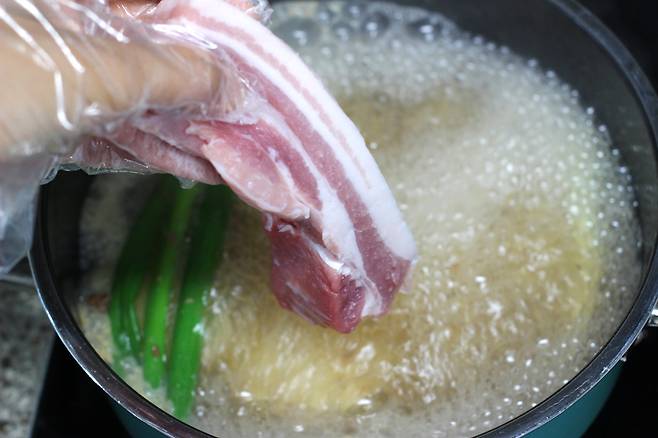 물이 팔팔 끓으면 삼겹살을 넣어요. 팔팔 끓을 때 넣어야 겉면이 빠르게 익으면서 부드러워요. 찬물에서 넣고 서서히 끓이면 육즙이 빠져나오기 때문에 맛이 좀 떨어지더라고요.