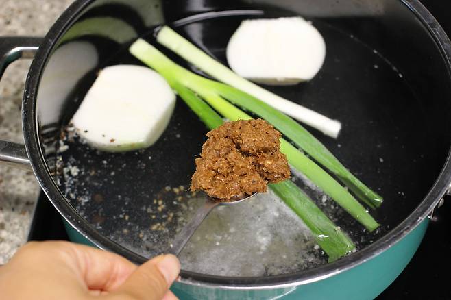 여기에 포인트 된장 1큰술 넣어줍니다. 된장은 돼지고기 잡내를 잡아주는 만능 양념이에요.