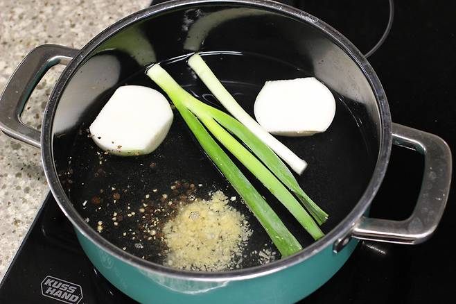 냄비에 삶을 물을 넉넉히 붓고 양파 1개, 대파 1대, 통후추 반큰술, 다진마늘 1큰술 넣어 팔팔 끓여요.