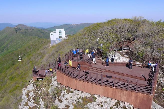 상부승강장에 도착하여 10여 분의 데크길을 올라가면 ‘녹산대 전망대’가 나오는데, 이곳에서 영남알프스의 웅장한 가지산, 백운산과 밀양 시내 방향의 얼음골 계곡 등을 조망할 수 있습니다.