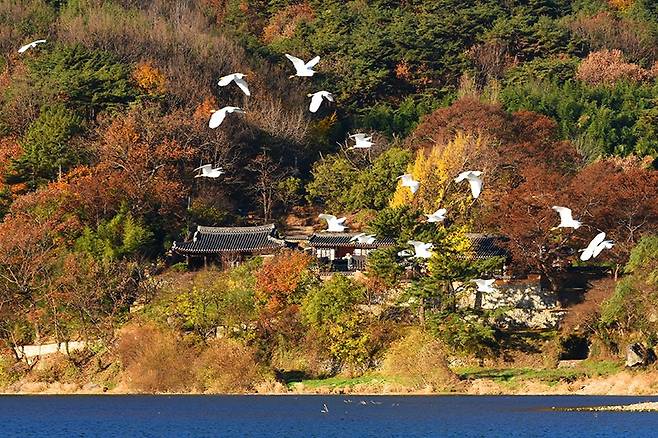 이곳은 신라시대 때 농업용수 공급을 위해 축조된 저수지로 백성들을 위한다는 의미에서 위양지라 불리는 곳입니다. 저수지 가운데에 5개의 작은 섬과 완재정이라는 작은 정자가 있는데요. 이곳에 이팝나무 등 진귀한 나무들을 심어 사시사철 아름다운 운치를 즐길 수 있도록 조성해 놓았죠.