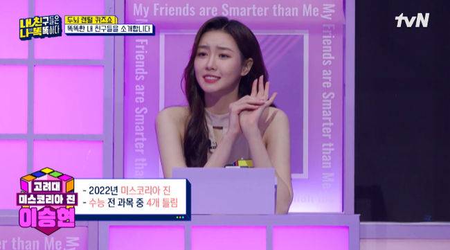 30일 방송된 tvN 예능프로그램 '내 친구들은 나보다 똑똑하다'(이하 '내친나똑')에서는 고려대학교 출신의 2022 미스코리아 진 이승현이 조세호의 친구로 등장해 눈길을 끌었다.