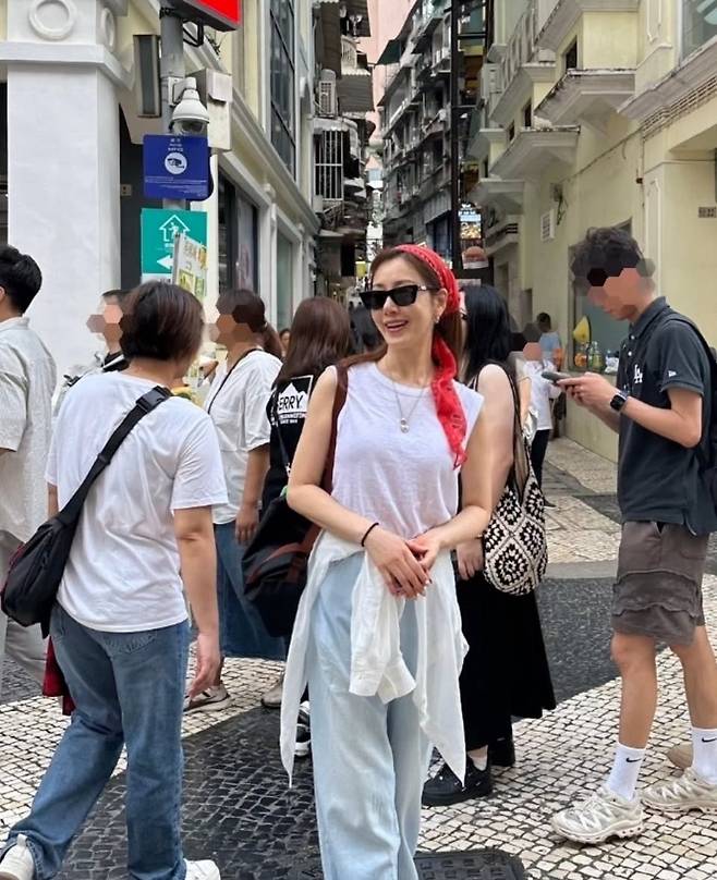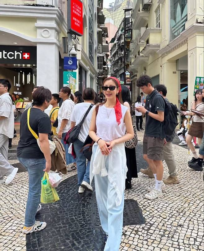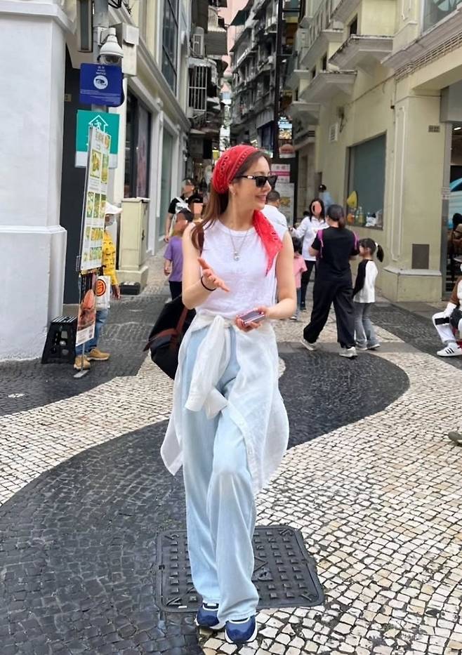 민소매 화이트 톱과 연청 와이드 팬츠로 시원한 분위기를 완성했으며, 허리에 가볍게 묶은 셔츠가 스타일에 실용성과 포인트를 동시에 더했습니다.
