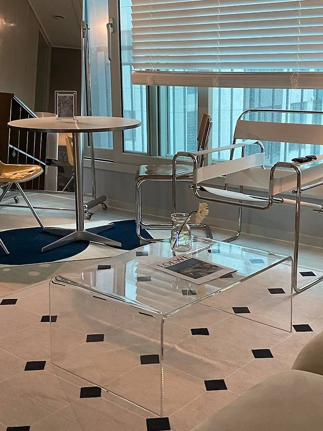 거실에 가구가 많아서 바닥 테이블은 투명으로 골랐어요. 아크릴 테이블인데, 투명이라 답답해 보이지 않아 좋아요.