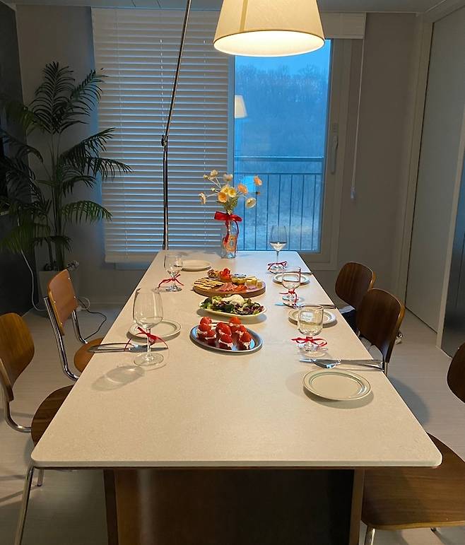 크리스마스 때에는 아들 친구 엄마들과 함께 맛있는 음식과 와인으로 파티를 했어요. 따듯한 느낌의 조명과 분위기 있는 음악을 곁들이니, 여느 레스토랑 부럽지 않더라고요.^^
