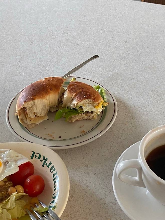 점심은 샐러드와 빵, 커피로 먹을 때가 많아요. 빵순이라 빵은 매일 먹어도 맛있거든요.