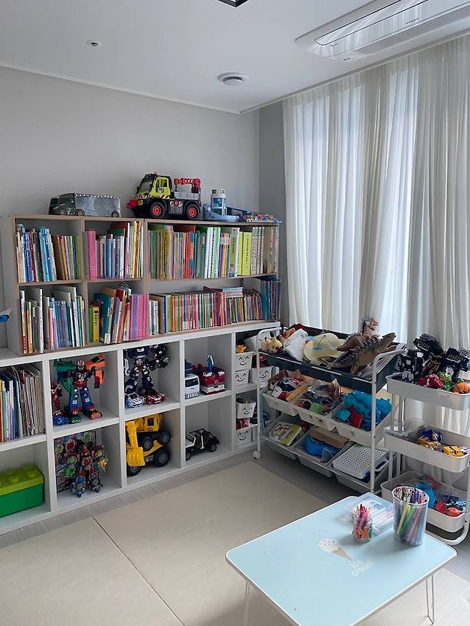 8살, 5살 아들 둘이 놀이하는 공간이에요. 장난감이 정말 많은데, 버리지 못하게 해서 그냥 가득 채워서 살고 있어요. 치워도 치워도 정말 정리가 잘 안되는 방이에요.