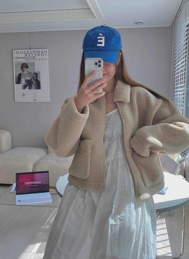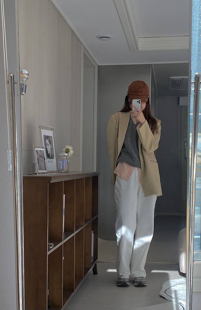 이동식 전신거울을 활용해서 블로그용 데일리 룩을 촬영하고 있어요.