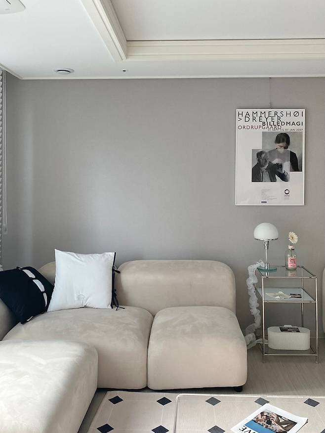 거실 벽 아트월 부분에 콘센트 구멍이 있어서 포스터와 액자로 가려주었어요. 은근히 보기 싫더라고요. 실버 컬러 조명과 색을 통일하여 액자도 실버 컬러로 맞추었어요.
