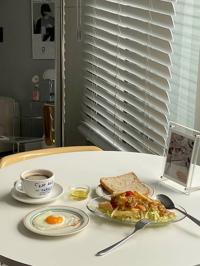 거실의 원형 테이블에서 가볍게 브런치 타임을 갖기도 해요. 혼자서도 예쁜 접시들에 플레이팅 해서 먹으면 기분이 좋아지더라고요!