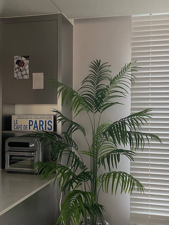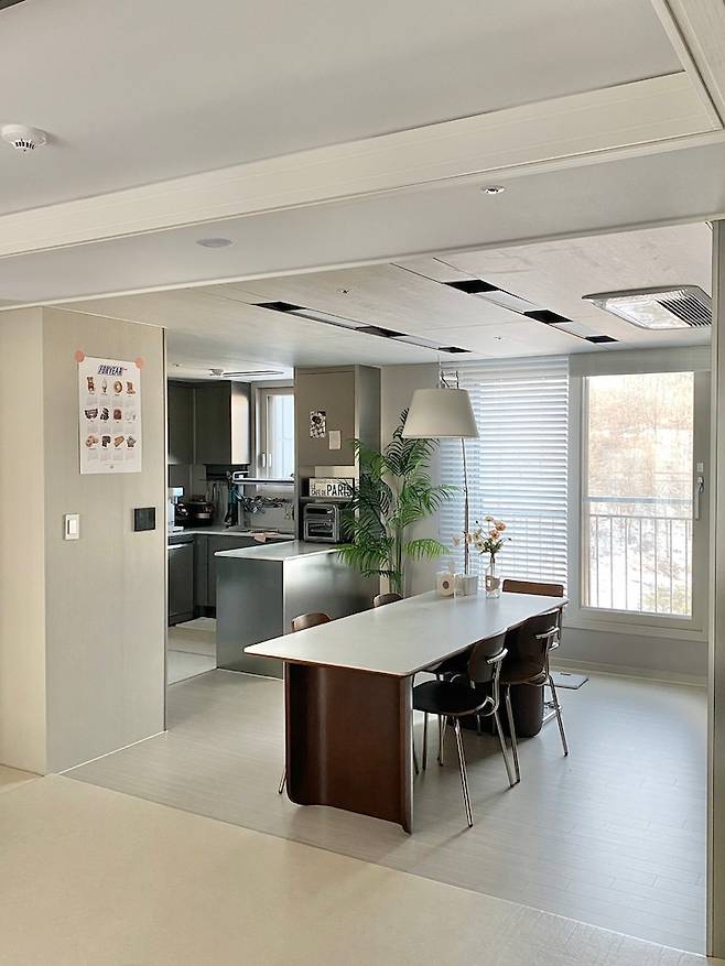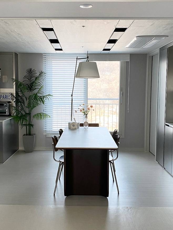 주방 식탁 위 매립형 조명이 맘에 들지 않아서 인테리어를 할까 했는데, 그냥 두고 별도 조명을 하나 추가로 구매해서 두었어요. 주방 창문도 거실과 통일하여 블라인드를 설치했고요, 옆에는 인조 나무를 두어 초록의 색을 하나 얹혔어요.