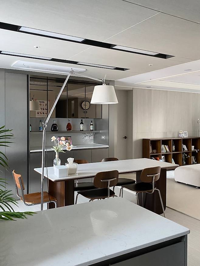 식탁은 거실의 책장과 같은 월넛 컬러로 맞춰 통일감을 주었어요. 저희 집 주방은 실버 컬러인데, 월넛 컬러와도 조화를 잘 이루더라고요.