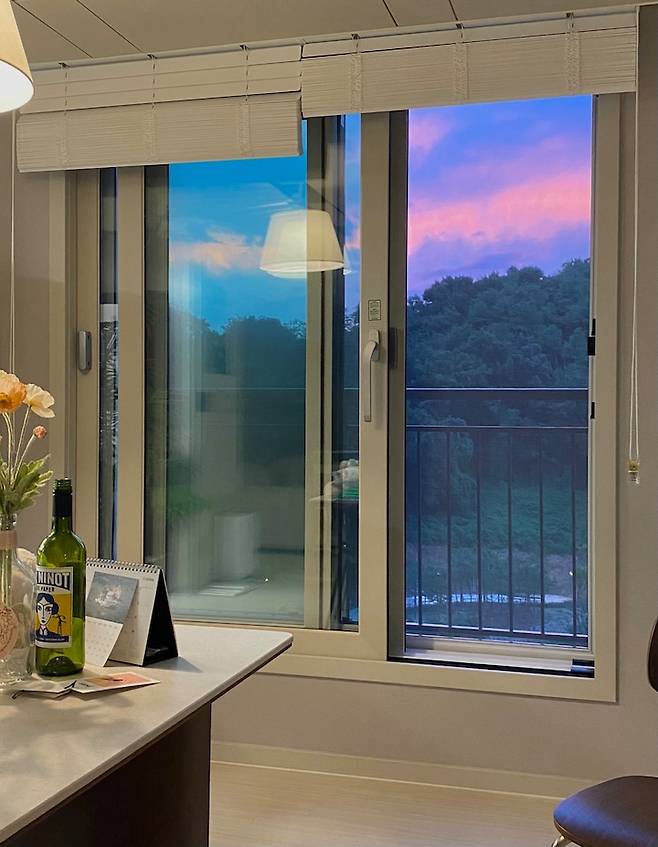 주방 창문으로 볼 수 있는 뷰예요. 뒤에 산이 있어 초록의 싱그러움과 핑크빛 노을까지 아름다운 장면이 연출되는 순간이에요.