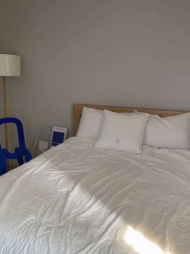 저희 침실이에요. 침대는 8년 전 결혼할 때 시몬스에서 구매했는데, 아직까지 사용하고 있어요. 이불은 화이트가 호텔 느낌도 나면서 좋더라고요. 조명과 의자, 매거진랙으로 공간을 꾸며보았습니다.