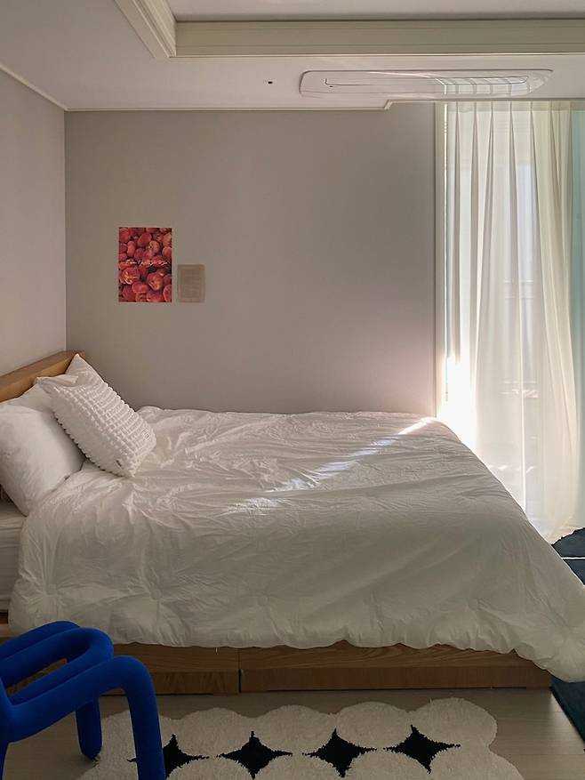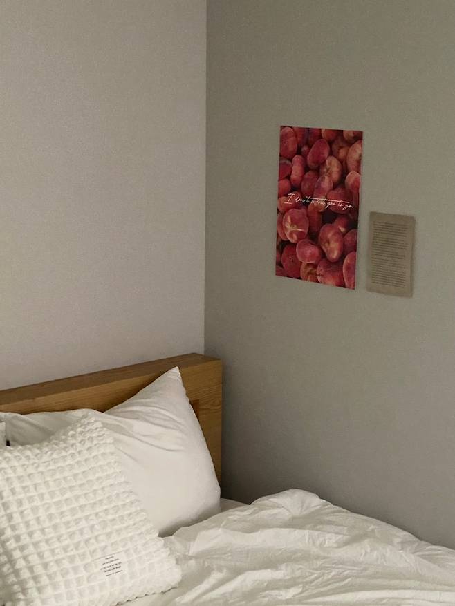 침대 옆에 납작 복숭아 포스터를 하나 붙여 두었더니, 허전했던 벽면에 힘이 생겼네요. 역시 공간에 변화를 주는 데에 가장 가성비 좋은 건 포스터인 듯해요.