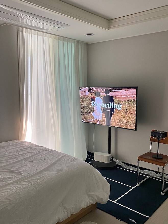 저희 부부는 TV 보는 일이 거의 없어서 이사 오면서 없앨까 하다가 침실에 TV를 두었어요. 근데 아이들이 침대에서 아주 편하게 누워서 잘 보더라고요. 안 버리길 참 잘했네요.