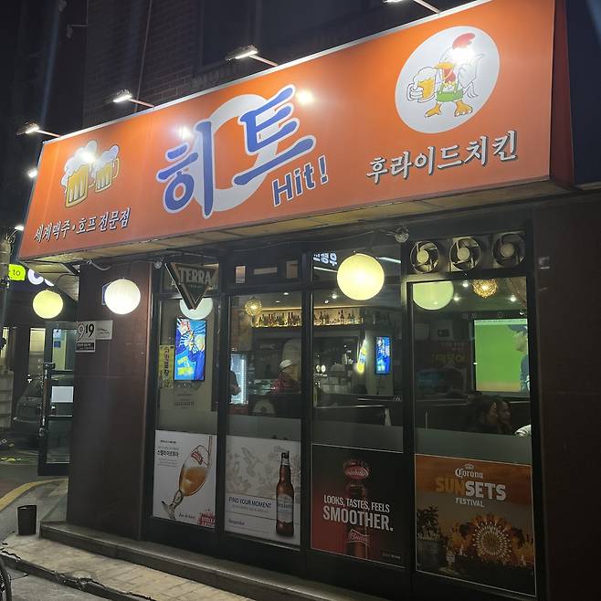 히트는 치맥이 땡길 때 가야하는 정겨운 호프집이야. 사장님이 정말 친절하시고, 메뉴들이 맛있고 푸짐해서 종종 가는 곳이지. 대표 메뉴는 후라이드 치킨과 국물 떡볶이! 국물 떡볶이는 길쭉한 누들떡인데, 맵거나 자극적이지 않고 야채가 많이 들어가 달짝지근한 야채 육수 맛이 특징이야. 후라이드 치킨은 생맥주랑 꼭 같이 먹어야 하는 거 알지? 대형 스크린도 있으니, 직관 티켓팅을 놓쳤다면 여기서 보는 것도 추천해.