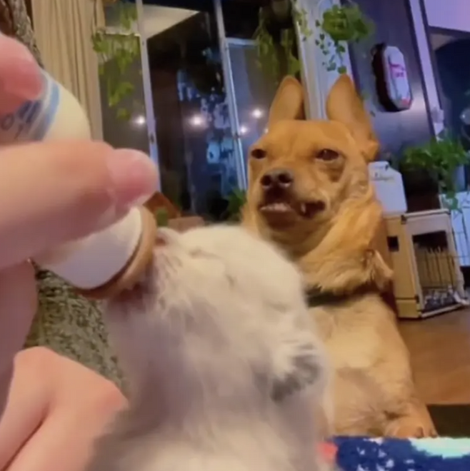 어느 견주가 길에서 아기 고양이를 구조해 집으로 데려왔습니다. 아기 고양이에게 젖병으로 우유를 먹이는 동안, 집 안의 강아지는 옆에서 이 모든 광경을 지켜보고 있었습니다.