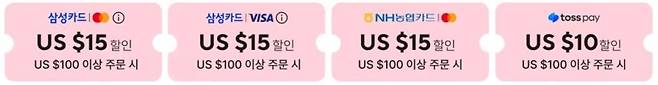 - NH농협카드(마스터) : $100 이상 구매시 $15 할인