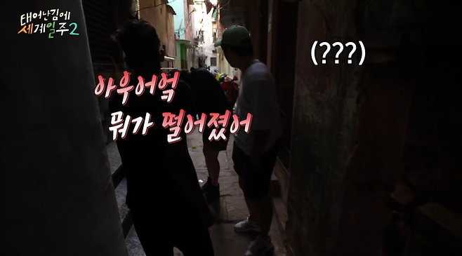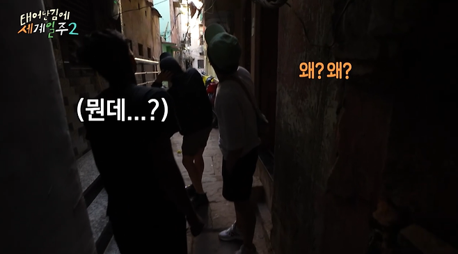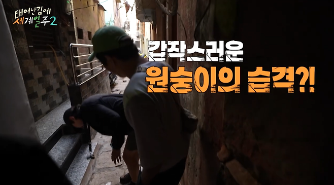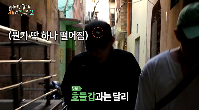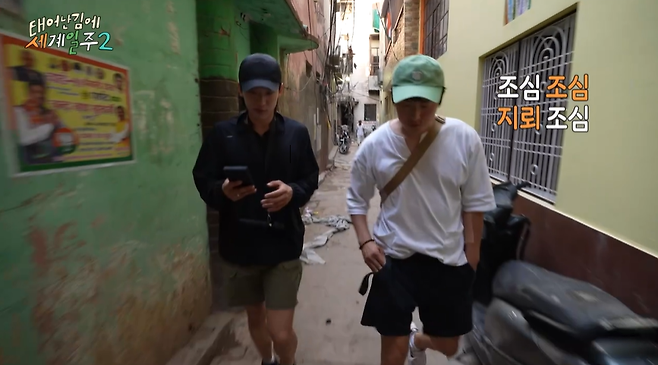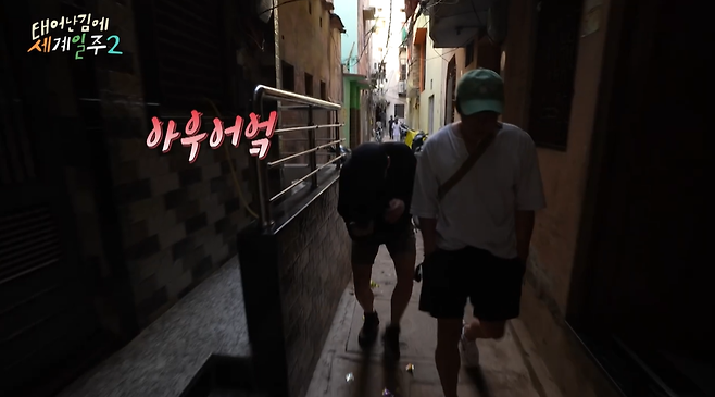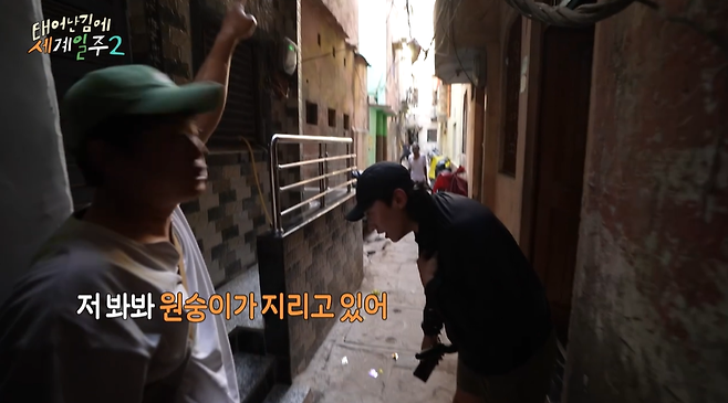 인도의 좁은 골목을 걷고 있는 기안84와 덱스. 땅 밑에 지뢰(?)들을 피해 조심스럽게 걷고 있습니다.