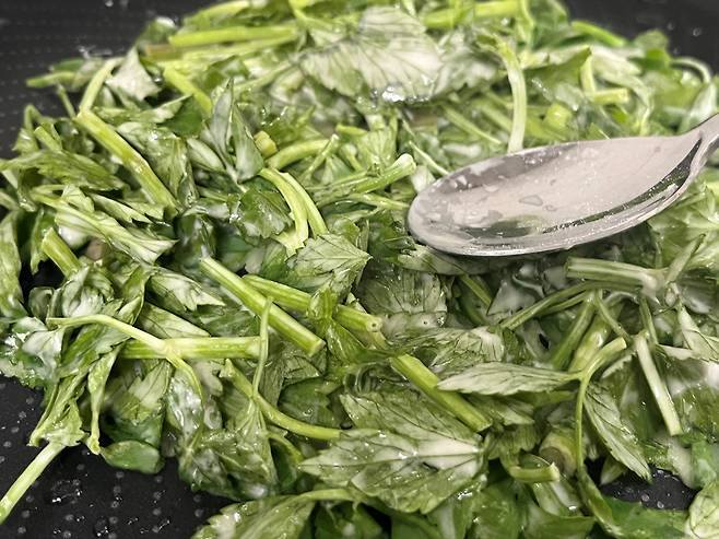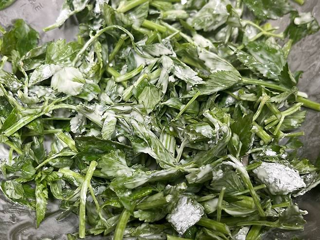 미나리는 칼로 숭덩숭덩 잘라서 넣어 주세요. 이파리 부분은 연하기 때문에 잘게 안 잘라도 되지만 줄기 부분은 비교적 잘게 잘라주는 것이 좋습니다.