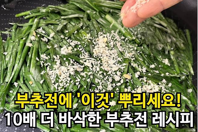 반죽 위에 빵가루를 살짝 뿌리세요. 이렇게 하면 부침개 겉면이 훨씬 바삭하게 구워집니다.