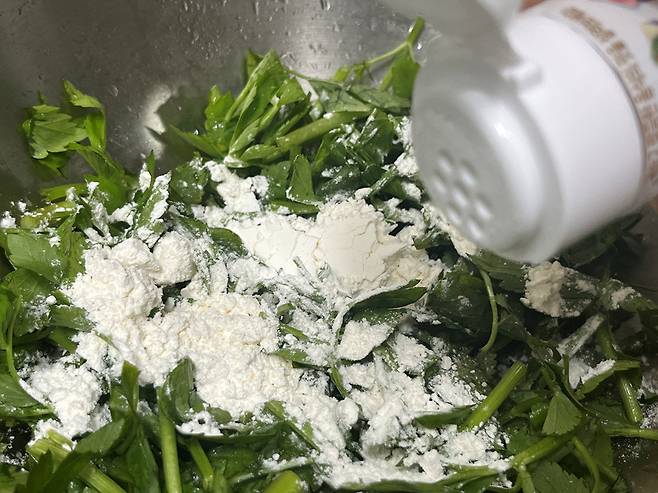 반죽이 살짝 묽은 농도가 되도록 물을 적당량 붓습니다. 그리고 미나리와 가루를 잘 풀어서 반죽을 만들어 주세요.