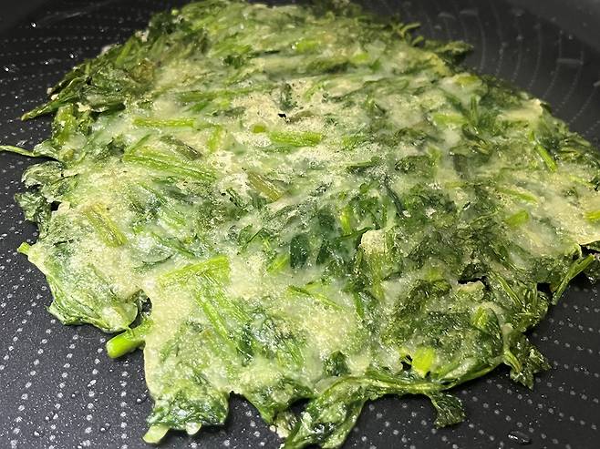 예열된 팬에 미나리 전 반죽을 그대로 올립니다. 중간에 빈 곳이 없도록 골고루 펴 주는 것이 중요합니다. 반죽을 올린 뒤에는 숟가락이나 뒤집개로 살짝 눌러가며 평평하게 정리해 주세요.