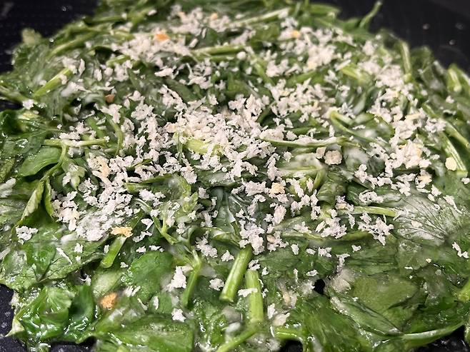 이렇게 미나리에 부침가루 반죽이 엉겨있으면 됩니다. 너무 질퍽하게 반죽이 묻어있을 필요는 없어요. 반죽이 많으면 오히려 전이 눅눅해집니다.