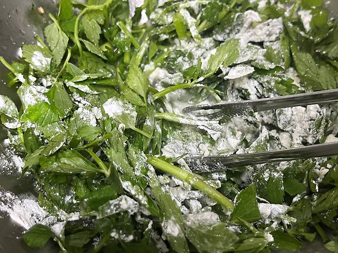 이렇게 미나리에 부침가루 반죽이 엉겨있으면 됩니다. 너무 질퍽하게 반죽이 묻어있을 필요는 없어요. 반죽이 많으면 오히려 전이 눅눅해집니다.