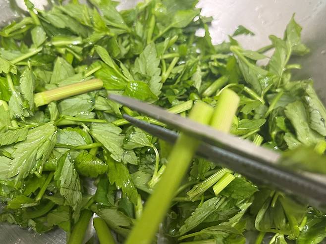 미나리는 칼로 숭덩숭덩 잘라서 넣어 주세요. 이파리 부분은 연하기 때문에 잘게 안 잘라도 되지만 줄기 부분은 비교적 잘게 잘라주는 것이 좋습니다.