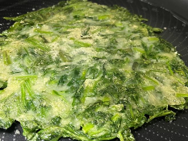 예열된 팬에 미나리 전 반죽을 그대로 올립니다. 중간에 빈 곳이 없도록 골고루 펴 주는 것이 중요합니다. 반죽을 올린 뒤에는 숟가락이나 뒤집개로 살짝 눌러가며 평평하게 정리해 주세요.