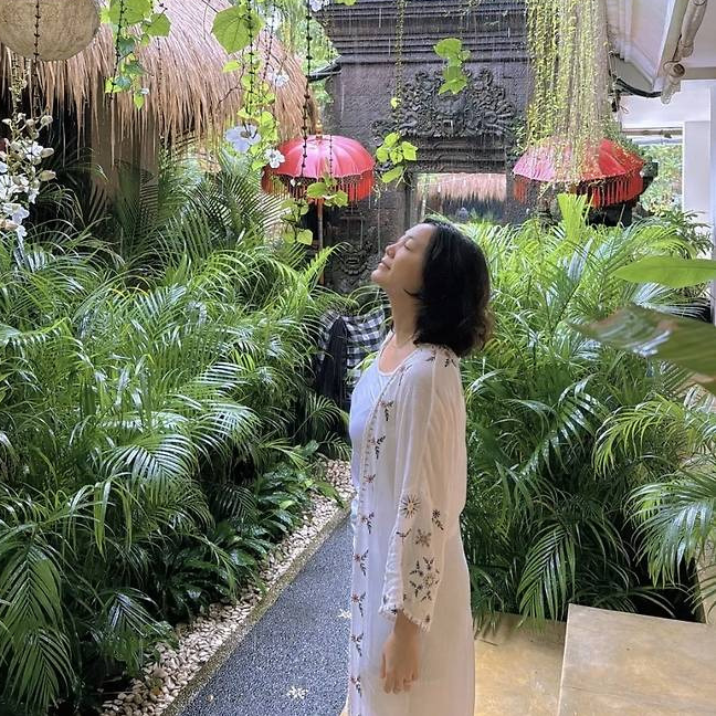 이어진 사진에서는 자연 속에서 편안한 화이트 원피스 위에 플라워 자수 로브를 걸치고 여유를 만끽하는 모습이 담겼습니다.