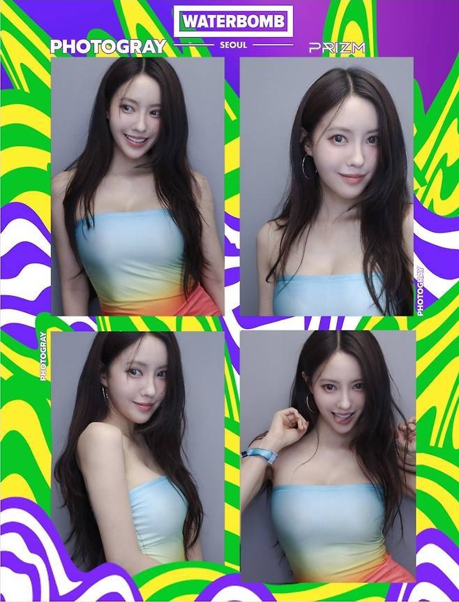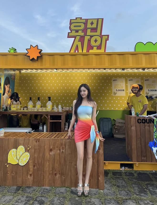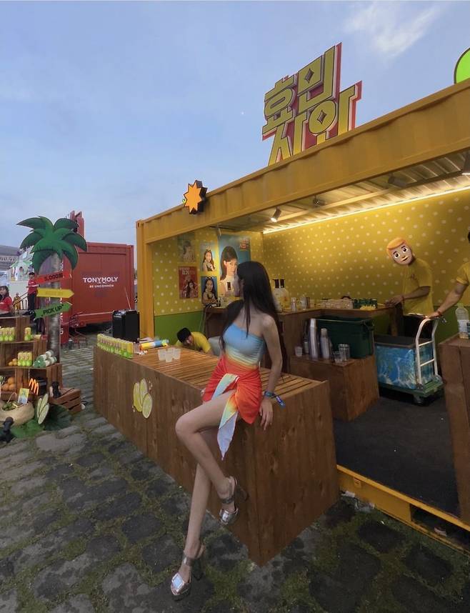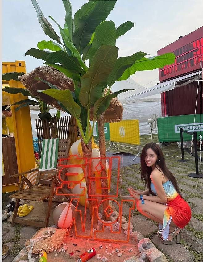 하늘색에서 옐로, 오렌지, 레드로 자연스럽게 이어지는 무지갯빛 그러데이션 튜브탑 원피스를 선택해 강렬한 햇빛 아래에서도 독보적인 존재감을 드러냈으며, 허리 옆을 묶은 랩 스커트 스타일의 디자인은 각선미를 더욱 돋보였습니다.