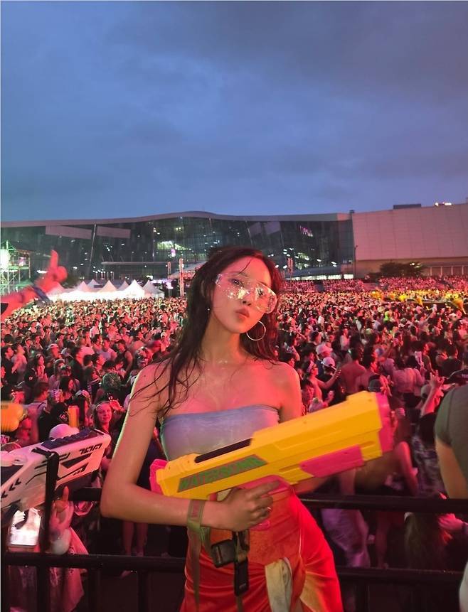 여기에 실버 메탈릭 플랫폼 샌들 힐로 시원하면서도 화려함을 더했고, 축제 특유의 에너지를 살린 물총과 워터밤 팔찌, 후프 이어링까지 섬세하게 매치하며 액세서리까지 페스티벌 무드에 딱 맞춘 센스를 자랑했습니다.