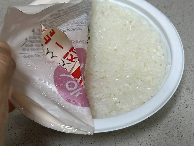 물이 끓기 시작하면 그 위에 햇반을 엎어 놓고 5분 정도 기다리세요.