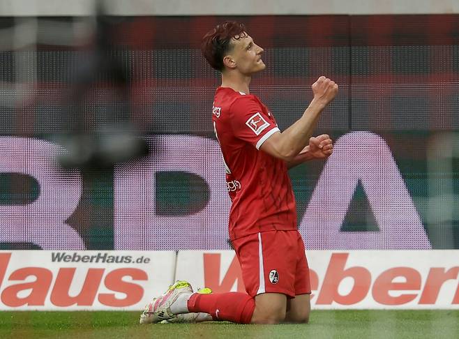 | ▲ 2025년 5월 4일 독일 프라이부르크에서 열린 SC 프라이부르크와 바이엘 04 레버쿠젠의 독일 분데스리가 경기에서 1-0 리드를 기록한 프라이부르크의 막시밀리안 에게슈타인이 세레머니를 하고 있다. |