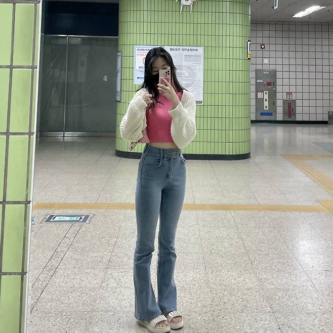 [부츠컷 청바지+통굽 슬리퍼] + [크롭 니트] 조합!