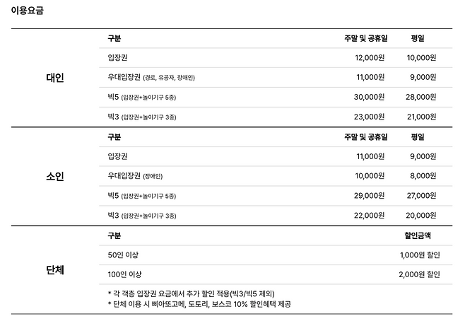 입장료는 대인 기준 1만원, 소인 9천원이며 빅3·빅5 패키지가 따로 있다. 경로·국가유공자·장애인은 할인 가능하고 단체 방문 시 추가 우대가 적용된다. 외부 음식과 반려동물은 입장 제한이 있으니 참고해야 한다.